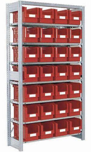 Polcos állvány piros műanyag dobozokkal. A dobozok mérete 35 x 21 x 20 cm. Szétszerelt állapotban szállítjuk - egyszerűen összeszerelhető csavarok nélkül. A polcok hátsó ütközővel rendelkeznek az esés elleni védelem érdekében.