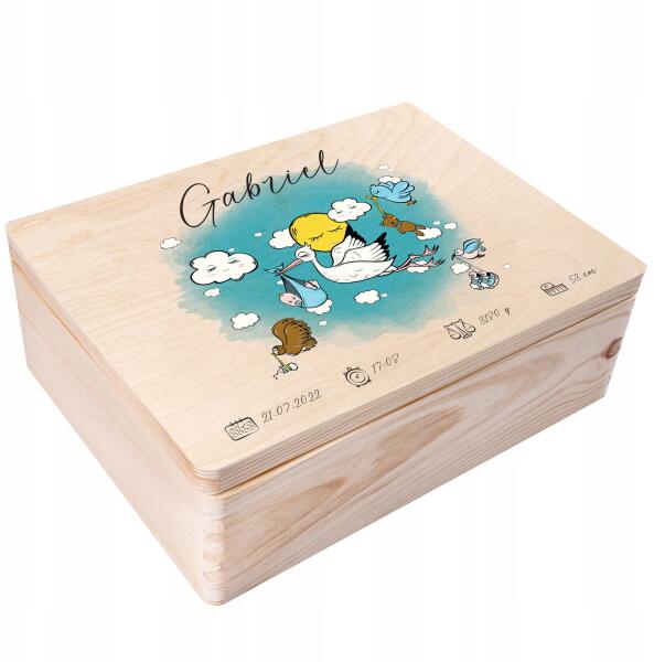Creative Deco Ajándékdoboz gyermeknek, emlék a születésre, keresztelőre, születésnapra, 40x30 cm (JANCDSD140BCUSTOMBABYSHOWERSTORKBOYFBM)ALLEGRO