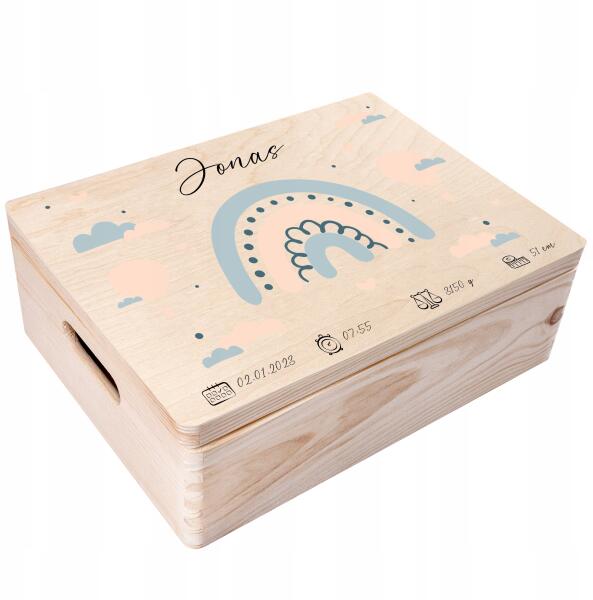 Creative Deco Doboz a gyermek születésére, fa anyakönyvi kivonat gravírozással, ajándék, 40x30x14 (JANCDSD140CUSTOMRAINBOWBMEMBOXFBM)ALLEGRO