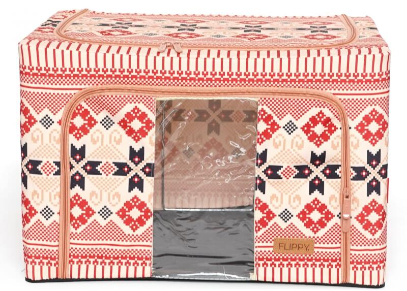 Flippy Összehajtható tárolódoboz, flippy, 66 l pamut és lenvászon, 52 x 42 x 39 cm, elülső ablak, 2 bejárati ajtó kétirányú cipzárral, fém keret, stabil műanyag alaptartó, hagyományos mintás 5-ös modell (132