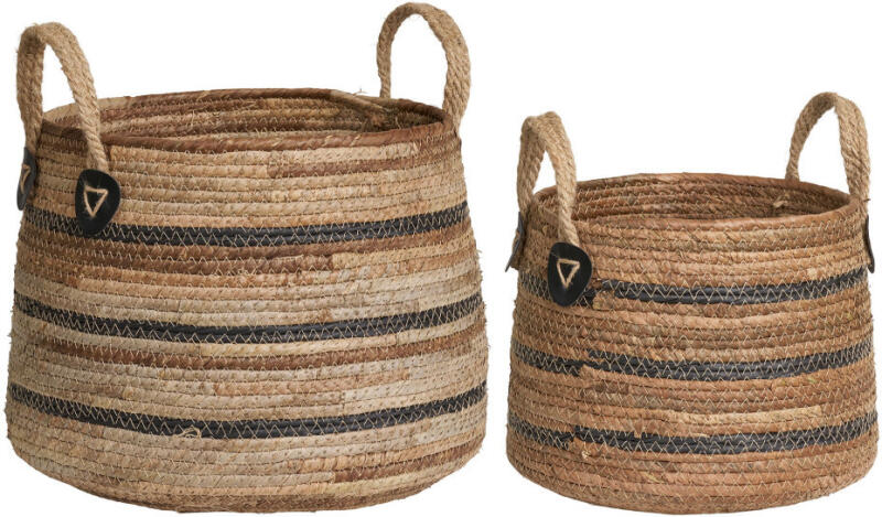 Erba kosárszett – banánlevél, natúr, 2 db Az Erba kosarak formailag elegánsabbak, enyhén kúpos kialakításuk révén nemcsak jól pakolhatók, hanem különleges megjelenést is adnak. A kisebb kosár mérete kb. Ø28 x 25 cm, a nagyobbé Ø32 x 29 cm. A banánlevélből készült szövés erős, mégis hajlékony, így ezek a kosarak alkalmasak textíliák, növényi kaspók vagy akár szennyes tárolására is. A tetejükön található fogantyúk megkönnyítik a mozgatást. ???? Miért különleges? Praktikus kialakítása mellett a hordozhatóságot is figyelembe vették – így dekoratív és mobil tárolóként is tökéletes.