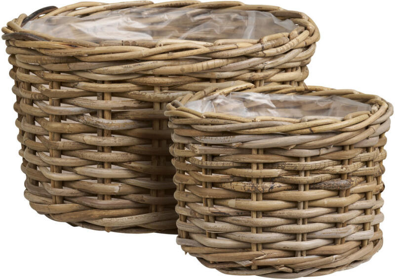 Kalak kosarak – kubu rattan, natúr, 2 db-os szett Méretek: Nagyobb kosár: Ø45 × 42 cm Kisebb kosár: Ø38 × 38 cm Anyag: kubu rattan Szín: natúr A Kalak kosarak természetes megjelenésükkel és fonott mintájukkal a vidéki és skandináv stílusú enteriőrök tökéletes kiegészítői. A vastag kubu rattan sűrű szövése nemcsak látványos, de igazán strapabíró is. Ideális textíliák, nagyobb játékok vagy akár növények tárolására is. ???? Különleges előnye: stílusos peremmel és masszív oldalakkal rendelkezik – így esztétikailag is kiemelkedő, miközben funkcióját is maximálisan betölti.
