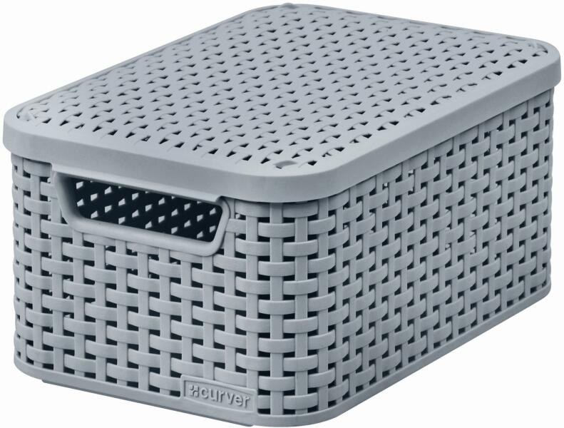 CURVER STYLE S méretű rattan kosár fedéllel, szürke 253006 (03617-099) A rattan hatást keltő "Style" vonal ezen fedeles kosarai a modern kialakításának köszönhetően tökéletesen illeszkedik bármilyen helyiségbe: fürdőszobákba, hálószobákba, vagy akár a nappalikban. Megfelelő alternatívát nyújt a valódi rattan bútorok helyettesítésére és tökéletes kiegészítője a termékcsoport további kategóriákban szereplő, szintén rattan felületű termékeinek. Műszaki adatok: