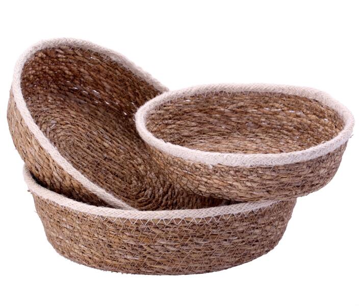 Ez a három ovális kosárból álló, fehér szegéllyel ellátott, tengeri fűből kötött kosárkészlet széleskörű felhasználási lehetőségei miatt minden otthonba tökéletes. A többféle méretnek köszönhetően a kosár mindig megtalálja a helyét és azt, amire ideálisan alkalmas. Szolgálhat tárolóként apróságoknak a fürdőszobában, kiegészítőknek az előszobában, bárminek, amit nem szeretne, hogy szanaszét heverjen. A kosarak méretei: